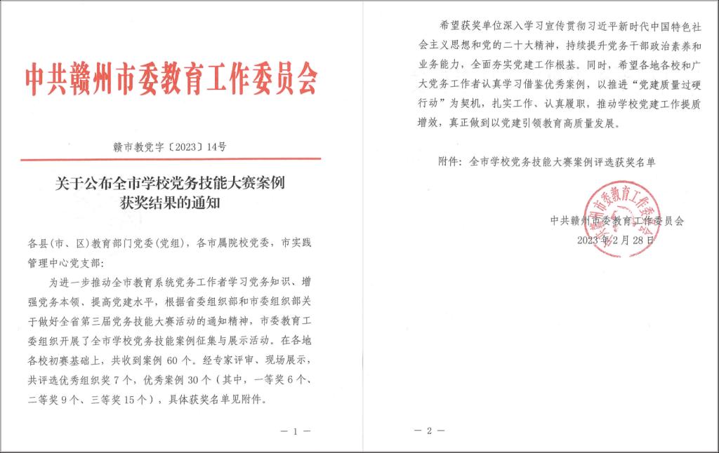 近日,中共贛州市委教育工作委員會(huì)公布了2022年度贛州市教育系統(tǒng)黨務(wù)技能大賽案例獲獎(jiǎng)名單,由我院思政課教師劉丹、劉苑冬所組成的團(tuán)隊(duì)榮獲二等獎(jiǎng),充分展現(xiàn)了我院黨務(wù)工作者出色的履職能力和工作水平。