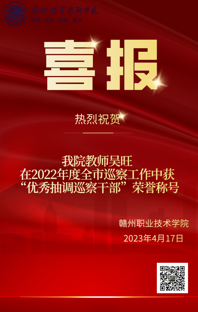 近日,中共贛州市委巡察工作領(lǐng)導(dǎo)小組印發(fā)《關(guān)于2022年度全市巡察工作先進(jìn)單位和先進(jìn)個(gè)人的通報(bào)》,我院教師吳旺獲評“優(yōu)秀抽調(diào)巡察干部”榮譽(yù)稱號。