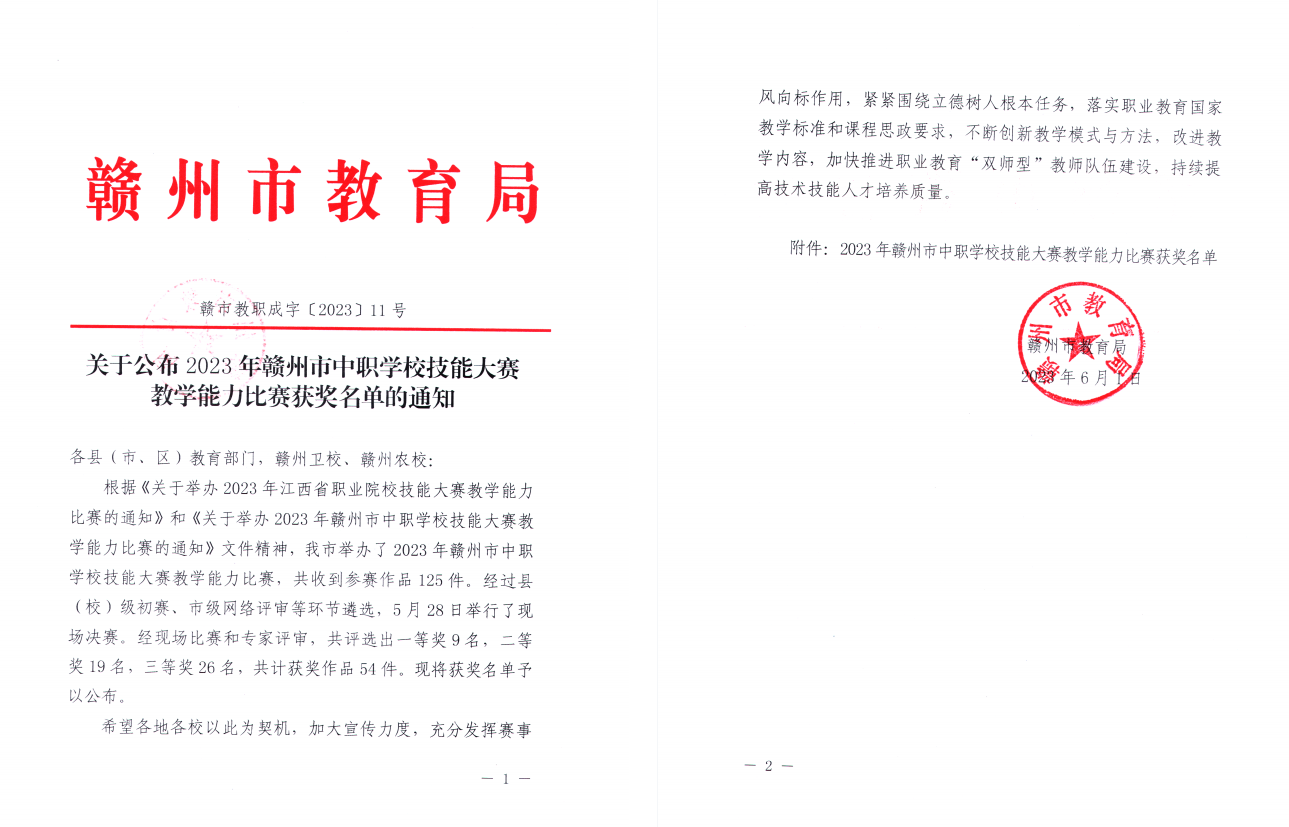 近日,贛州市教育局公布了2023 年贛州市中職學校技能大賽教學能力比賽獲獎名單,我院教師參賽隊伍在比賽中獲佳績。
