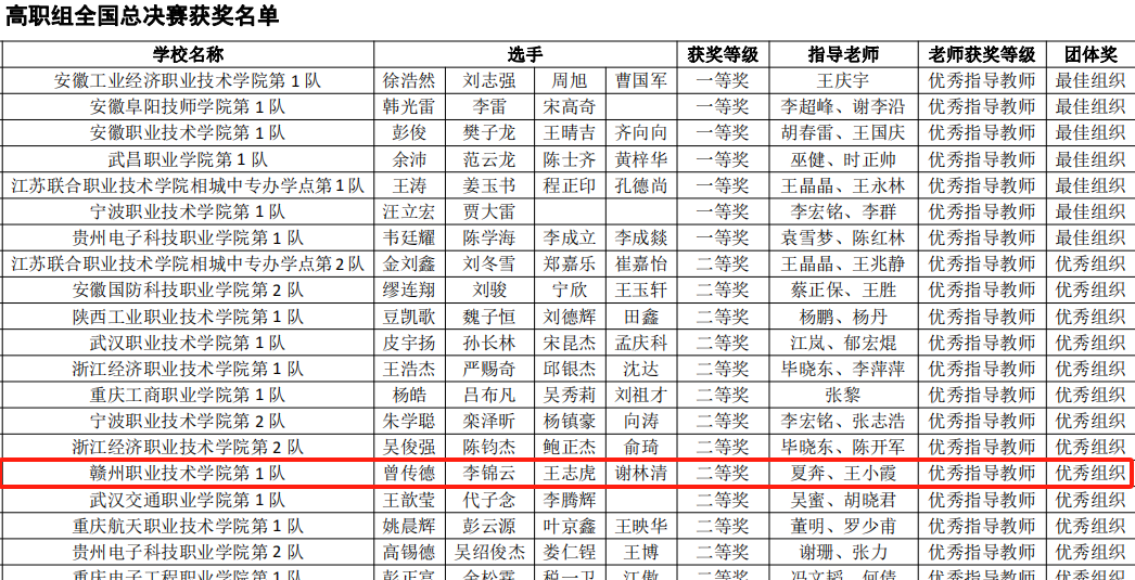 本賽事共吸引來自全國共190支隊伍717名選手參賽,經過激烈角逐,共有65支隊伍進入全國總決賽。我院信息工程系學子曾傳德、李錦云、王志虎、謝林清團隊榮獲高職組二等獎,指導教師夏奔、王小霞榮獲“優秀指導教師”稱號,我院榮獲“優秀組織”團體獎。
