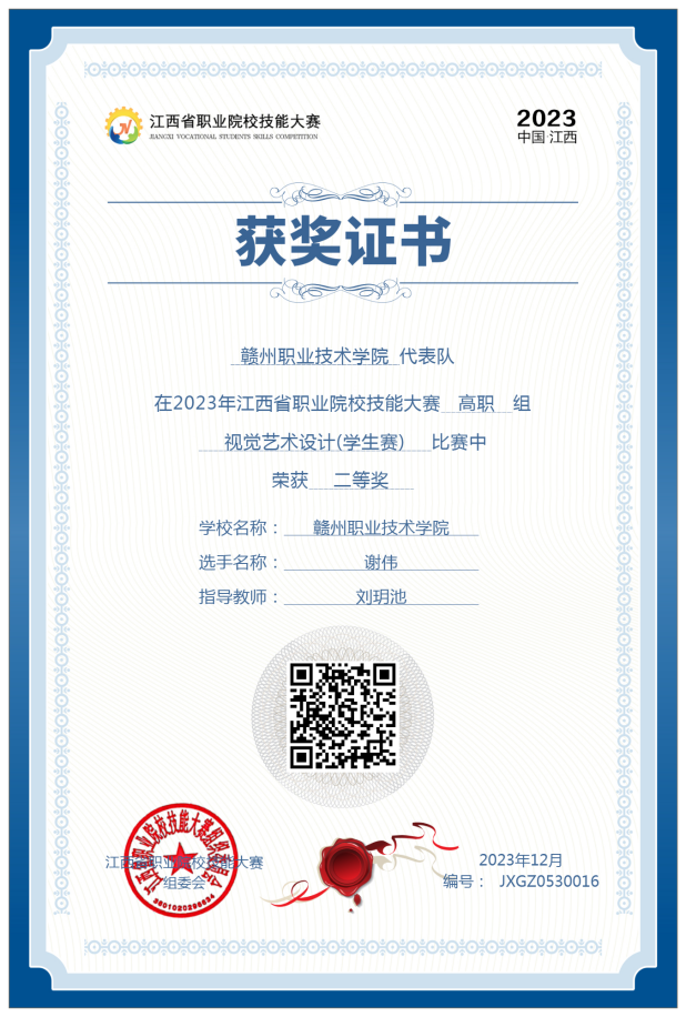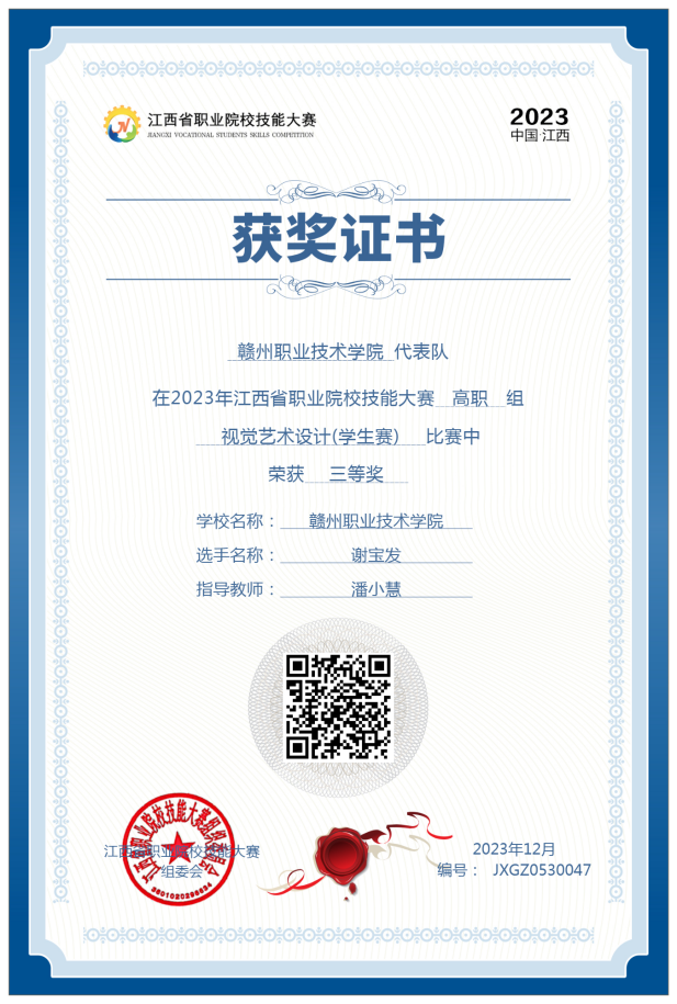 12月7日,2023年江西省職業(yè)院校技能大賽(高職組)視覺藝術(shù)設(shè)計(jì)賽項(xiàng)在江西工業(yè)職業(yè)技術(shù)學(xué)院舉辦。據(jù)悉,來(lái)自全省35所院校共計(jì)82名選手參加了此次江西省“視覺藝術(shù)設(shè)計(jì)”賽項(xiàng)。經(jīng)過(guò)激烈的角逐,由藝術(shù)設(shè)計(jì)系劉玥池老師指導(dǎo)的數(shù)媒2211班學(xué)生謝偉獲得二等獎(jiǎng),由藝術(shù)設(shè)計(jì)系潘小慧老師指導(dǎo)的廣告2212班學(xué)生謝寶發(fā)獲得三等獎(jiǎng)。