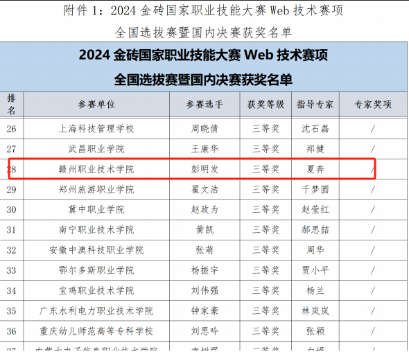近日,2024金磚國家職業技能大賽Web技術賽項全國選拔賽暨國內決賽在濟寧職業技術學院成功舉辦,來自全國的49支參賽隊伍參與本次比賽。經過激烈地競技角逐,我校信息工程學院學生彭明發在本次大賽中斬獲三等獎。