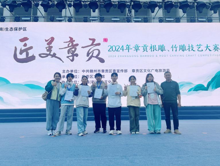 在11月10日圓滿落幕的“匠美章貢”2024年根雕、竹雕技藝大賽中,藝術設計學院的學生團隊與專業成人組同場競技,經過不懈努力,始終在賽事中取得優異成績。來自24廣告班的嚴玉婷同學獲得根雕項目學生組三等獎;楊長盛、郭文浩同學獲得根雕項目專業成人組三等獎,袁能月、王紫涵以及鄒子越同學分別獲得優勝獎的成績。