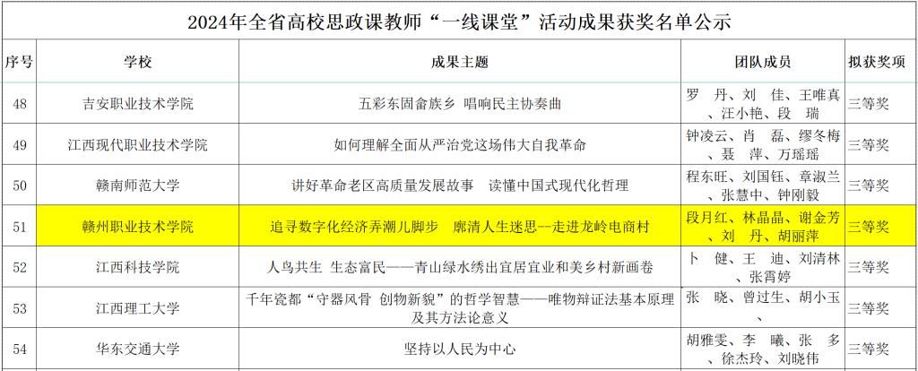 近日,江西省教育廳發(fā)布全省高校思想政治課教師“一線課堂”優(yōu)秀成果評選結(jié)果公示,我校推薦的《思想道德與法治》一線課堂成果“追尋數(shù)字化經(jīng)濟弄潮兒腳步廓清人生迷思--走進龍嶺電商村”榮獲省三等獎。