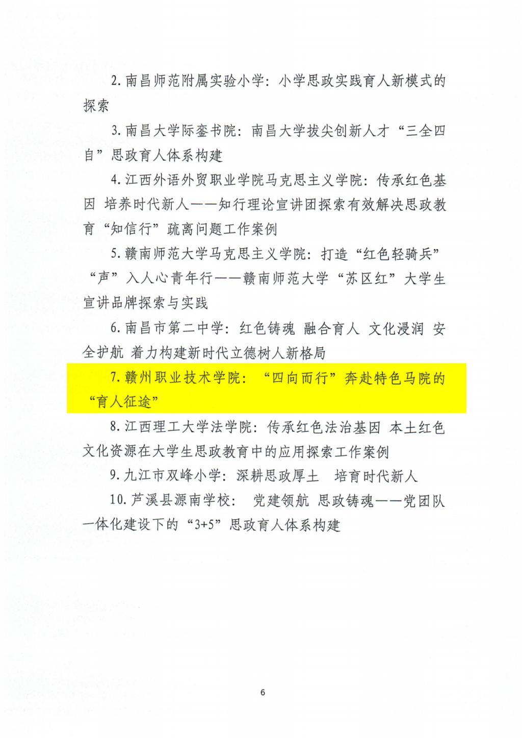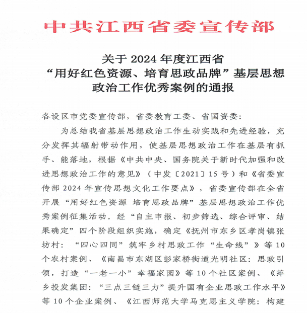 近日,江西省委宣傳部通報(bào)了2024年度江西省“用好紅色資源 培育思政品牌”基層思想政治工作優(yōu)秀案例,我校推薦的《“四向而行”奔赴特色馬院的“育人征途”》成功入選。