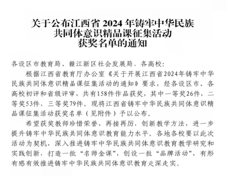 近日,江西省教育廳辦公室公布了2024年鑄牢中華民族共同體意識精品課征集活動獲獎名單,學(xué)校教師團(tuán)隊經(jīng)過精心籌備,取得了高校組三等獎的較好成績。