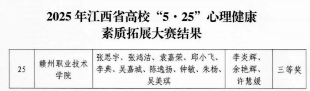 近日,2025年江西省高校“5?25”心理健康素質拓展大賽獲獎名單正式公布。本次大賽由江西省委教育工委、省教育廳聯合主辦,吸引全省110余所高校、超百萬大學生踴躍參與。賽事以“拓展智慧潛能?塑造陽光心態”為核心宗旨,通過多元素質拓展項目,助力青年學子在協作與挑戰中提升心理韌性。