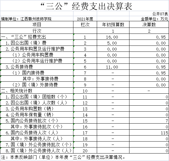 十六、“三公”經(jīng)費:指用一般公共預算財政撥款安排的因公出國(境)費、公務用車購置及運行維護費和公務接待費。其中,因公出國(境)費反映單位公務出國(境)的國際旅費、國外城市間交通費、住宿費、伙食費、培訓費、公雜費等支出;公務用車購置及運行維護費反映單位公務用車車輛購置支出(含車輛購置稅、牌照費),按規(guī)定保留的公務用車燃料費、維修費、過橋過路費、保險費、安全獎勵費用等支出;公務接待費反映單位按規(guī)定開支的各類公務接待(含外賓接待)支出。
