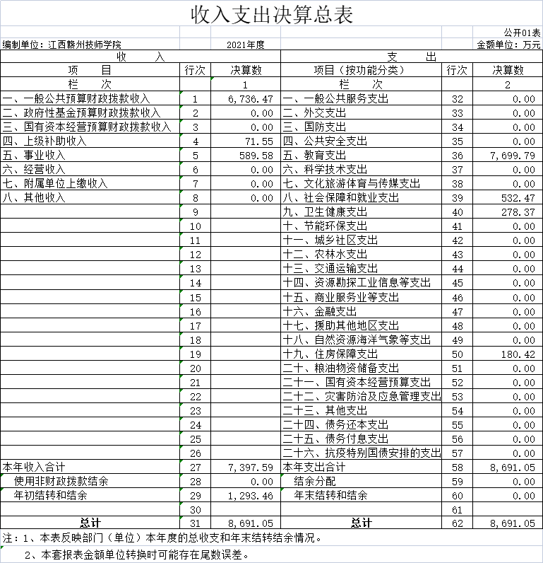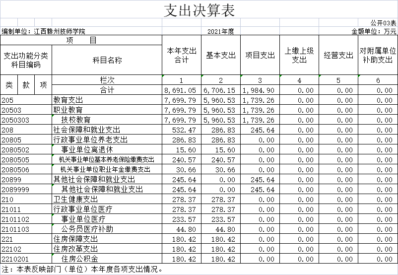 本單位2021年度支出總計8691.05萬元,其中本年支出合計8691.05萬元,較2020年減少1038.41萬元,下降10.67%,主要原因是:贛州市綜合型公共實訓基地項目接近尾聲,本年列支較上年下降;年末結轉和結余0萬元,較2020年減少1259.58萬元,下降100%,主要原因是:本年無結轉結余是單位執(zhí)行財政零基預算政策且我院加快項目推進,加快專項資金支出。