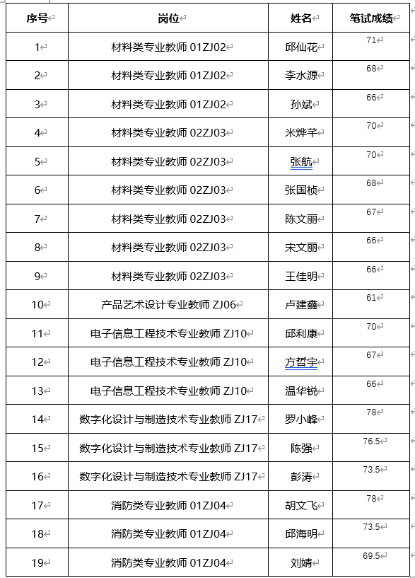 根據《贛州職業技術學院2024年面向社會公開招聘工作人員公告》要求,有6個崗位增設了筆試環節,筆試已于2024年7月28日9:00-10:30完成,根據招聘公告,入闈面試人員名單依據筆試成績60分(含60分)以上者從高分到低分按崗位招聘計劃數1:3的比例確定,現將入闈面試人員名單公布如下: