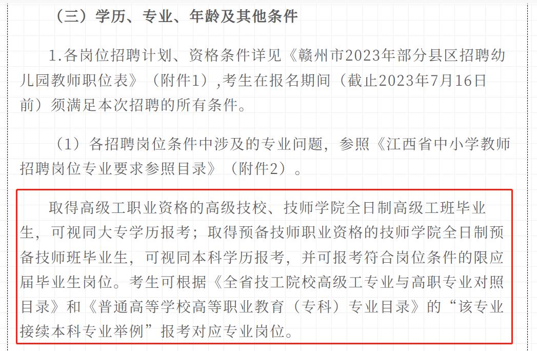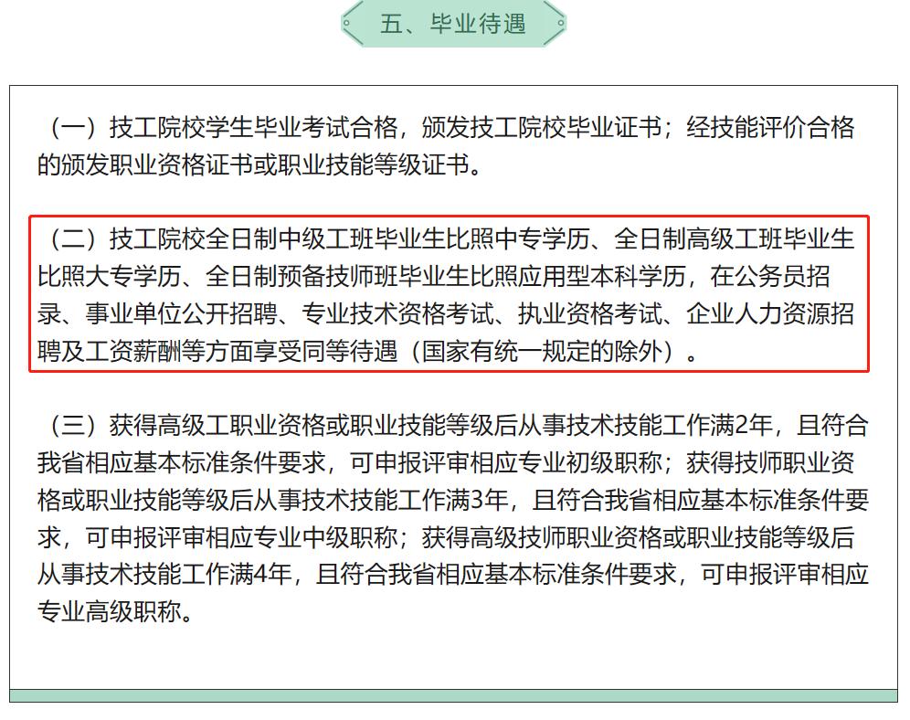 技工院校全日制高級工班畢業生比照大專學歷、全日制預備技師班畢業生比照應用型本科學歷,在公務員招錄、事業單位公開招聘、專業技術資格考試、執業資格考試、企業人力資源招聘及工資薪酬等方面享受同等待遇。有關資訊可參考下面鏈接及圖片: