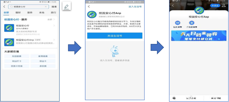 打開手機里的“支付寶”APP,在支付寶搜索欄選擇“生活號”輸入“校園安心付”,再關注此生活號,進入生活號選擇“江西云繳費”。
