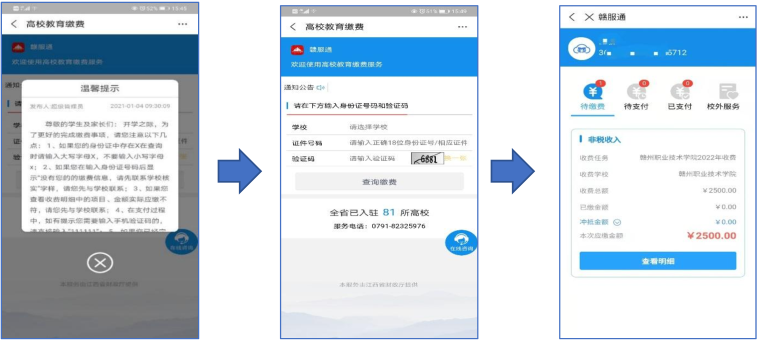 閱讀了“繳費須知”,進入個人信息登錄頁面,在“學校欄”里選擇“贛州職業技術學院”,在“贛服通”界面依次輸入身份證號及驗證碼,點擊“開始查詢”,可看到該賬號目前待繳項目,再次點擊“查看詳情”進入。