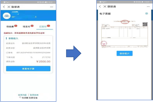 在“已支付”訂單里,點擊“查看電子票”,即可獲取電子票(非稅電子票和往來電子收據),可下載保存圖片或自行打印電子發票。