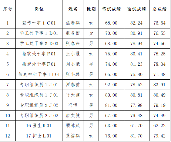 根據《贛州職業(yè)技術學院2021年面向社會公開招考工作人員公告》的工作安排,贛州職業(yè)技術學院2021年招聘工作人員面試工作已完成。根據招聘公告規(guī)定,各崗位入闈體檢和考察環(huán)節(jié)的人員,按照總成績從高分到低分與招聘崗位人數1:1的比例確定,現將入闈體檢考察人員名單予以公告(詳見附件)。