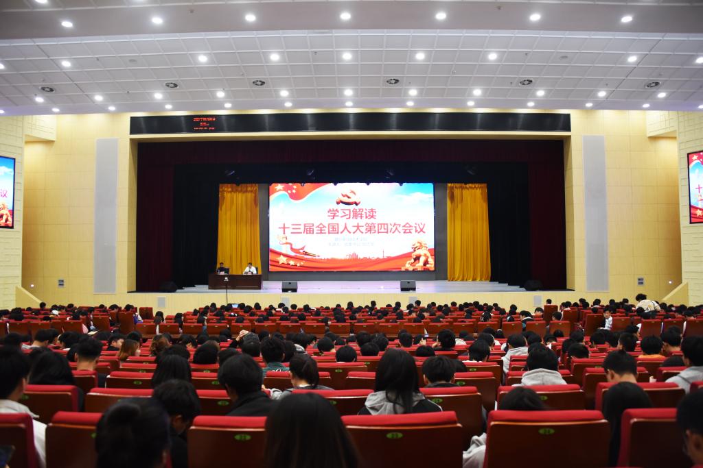 3月24日下午,黨委書記鄒志華給全校學生作形勢與政策課專題講座《學習解讀十三屆全國人民代表大會第四次會議》,專題講座設主會場與分會場,以視頻形式同步直播,教務處、馬克思主義學院等相關部門負責同志,思政課老師代表和學院二千余名學生聆聽了專題講座,講座由教務處處長楊孟鴻主持。