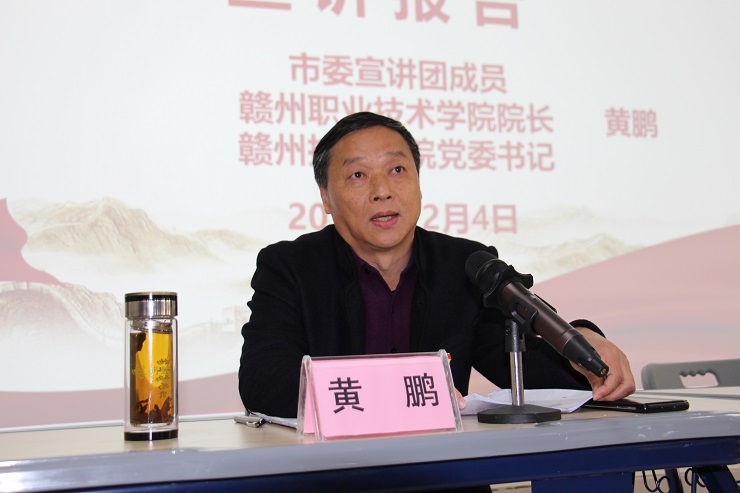 12月4日,市委宣講團(tuán)成員、贛州職業(yè)技術(shù)學(xué)院院長、贛州技師學(xué)院黨委書記黃鵬在學(xué)院陽明樓110階梯教室為學(xué)院師生作了學(xué)習(xí)貫徹黨的十九屆四中全會(huì)精神宣講報(bào)告。宣講會(huì)由學(xué)院黨委書記鄒志華主持,學(xué)院在家領(lǐng)導(dǎo)班子成員、全體教職員工和部分學(xué)生代表共200余人在現(xiàn)場聆聽了宣講。
