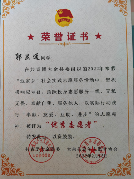 郭顯通被共青團大余縣委表彰為“優秀志愿者”