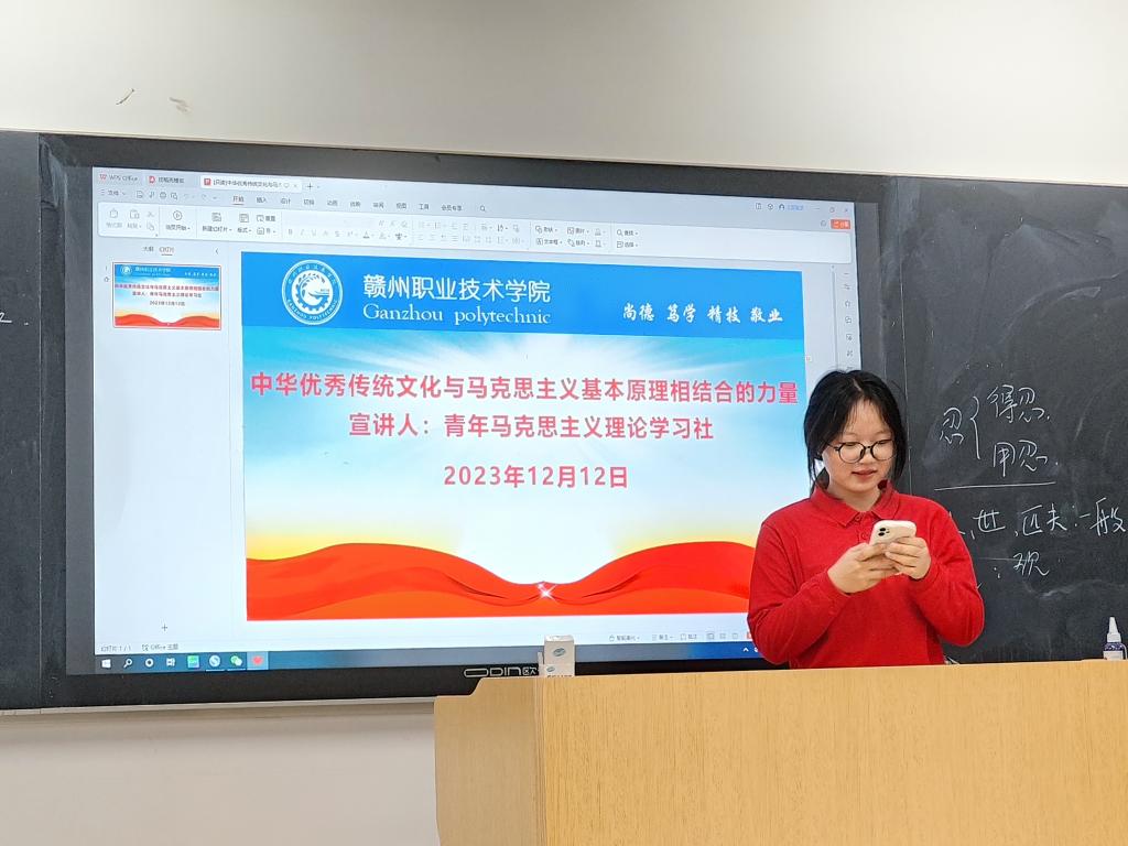 為深入學習領會習近平總書記關于“堅持把馬克思主義基本原理同中華優(yōu)秀傳統(tǒng)文化相結合”重要論述的豐富內涵、精神實質和實踐要求,全面深化對推進馬克思主義中國化時代化規(guī)律性的認識,深刻領會以馬克思主義為指導推動中華優(yōu)秀傳統(tǒng)文化創(chuàng)造性轉化、創(chuàng)新性發(fā)展的使命任務和工作要求。我院青年馬克思主義學習社社員們于12月11日在各班開展“中華優(yōu)秀傳統(tǒng)文化與馬克思主義基本原理相結合的力量”宣講活動。