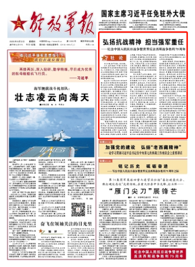 走進歷史是為了走向未來,紀念勝利是為了永遠勝利。今天,我們紀念中國人民抗日戰(zhàn)爭暨世界反法西斯戰(zhàn)爭勝利75周年,就是要弘揚抗戰(zhàn)精神,擔當強軍重任,忠實履行保衛(wèi)祖國安全和人民和平生活的神圣職責,忠實執(zhí)行維護世界和平的神圣使命。讓我們更加緊密地團結(jié)在以習近平同志為核心的黨中央周圍,增強“四個意識”、堅定“四個自信”、做到“兩個維護”,貫徹軍委主席負責制,堅持政治建軍、改革強軍、科技強軍、人才強軍、依法治軍,聚力練兵備戰(zhàn),銳意開拓進取,為實現(xiàn)黨在新時代的強軍目標、把人民軍隊全面建成世界一流軍隊不懈奮斗,為決勝全面建成小康社會、奪取新時代中國特色社會主義偉大勝利、實現(xiàn)中華民族偉大復興的中國夢貢獻力量。
