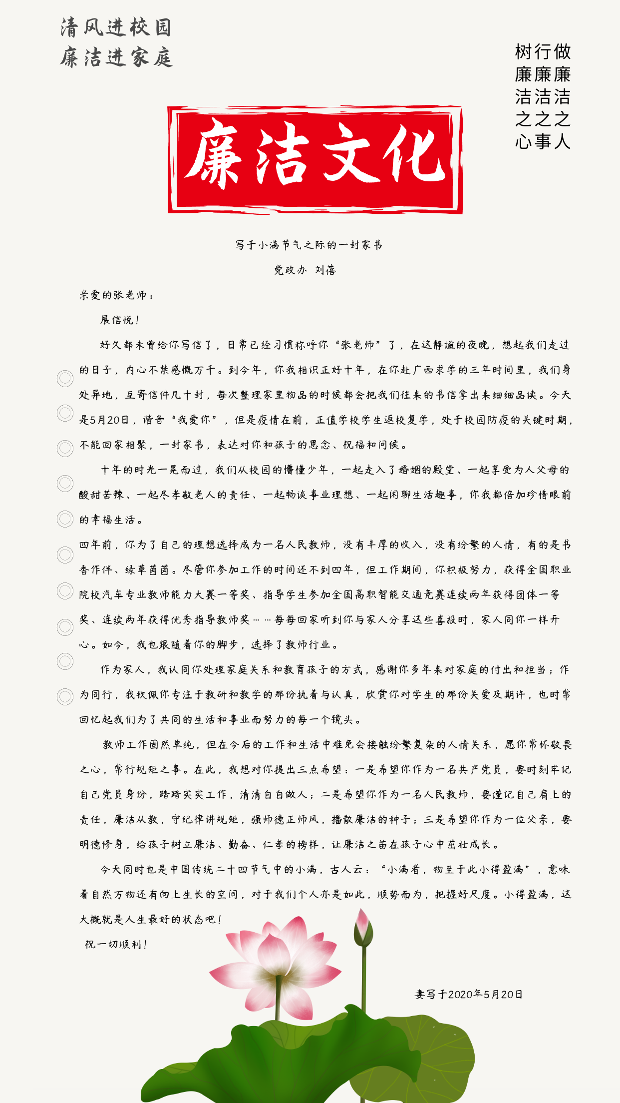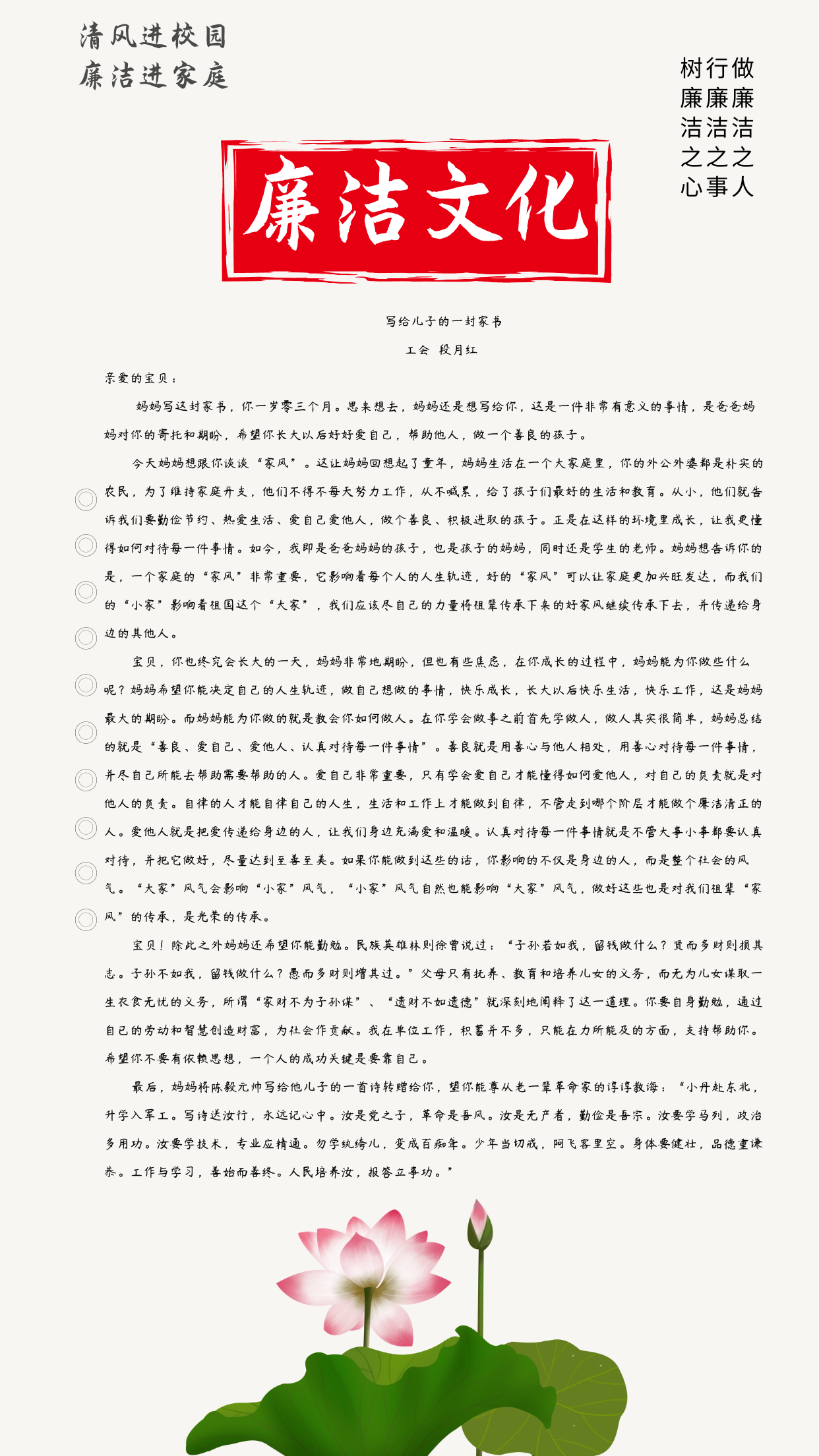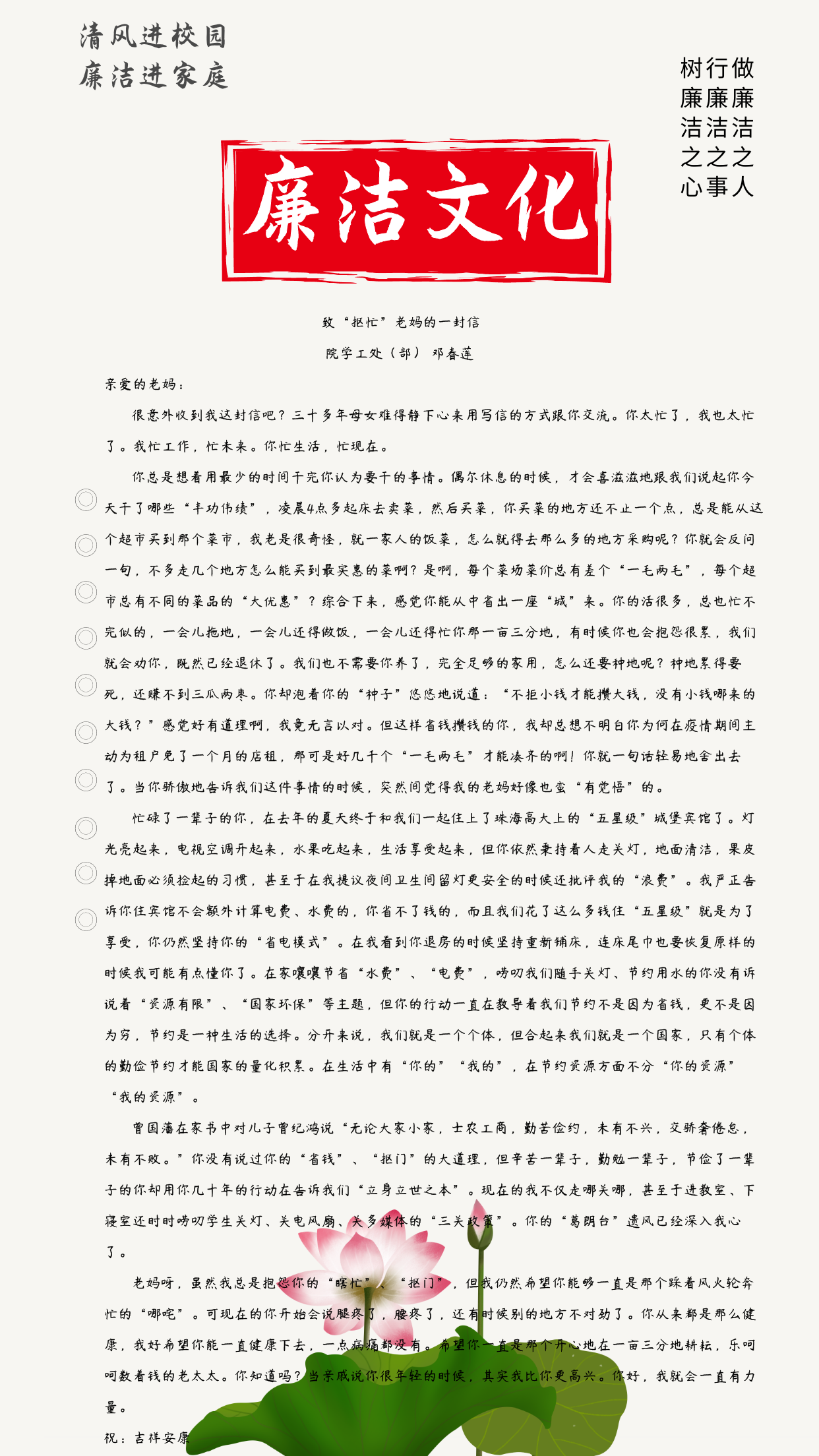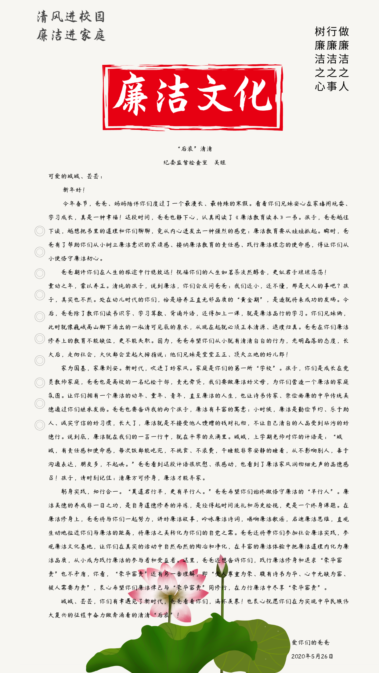 據市紀委《關于做好贛州市第九屆“廉政文化月”活動的通知》要求,學院積極組織開展廉潔家書征集活動,共收到作品10篇,征集到的一封封廉潔家書情真意切,既提醒了身邊親人要遠離腐敗、保持廉潔,又表達了自身及其家庭成員對廉潔奉公、樹好家風的感悟,也通過撰寫廉潔家書的形式加強了與家人之間的情感交流。學院以此為契機,倡導全體教職工家屬當好“廉內助”,把好家庭“廉政關”,為進一步達到廉政教育效果奠定了堅實基礎。現將有關作品予以推送,請全體教職工予以重視與關注。