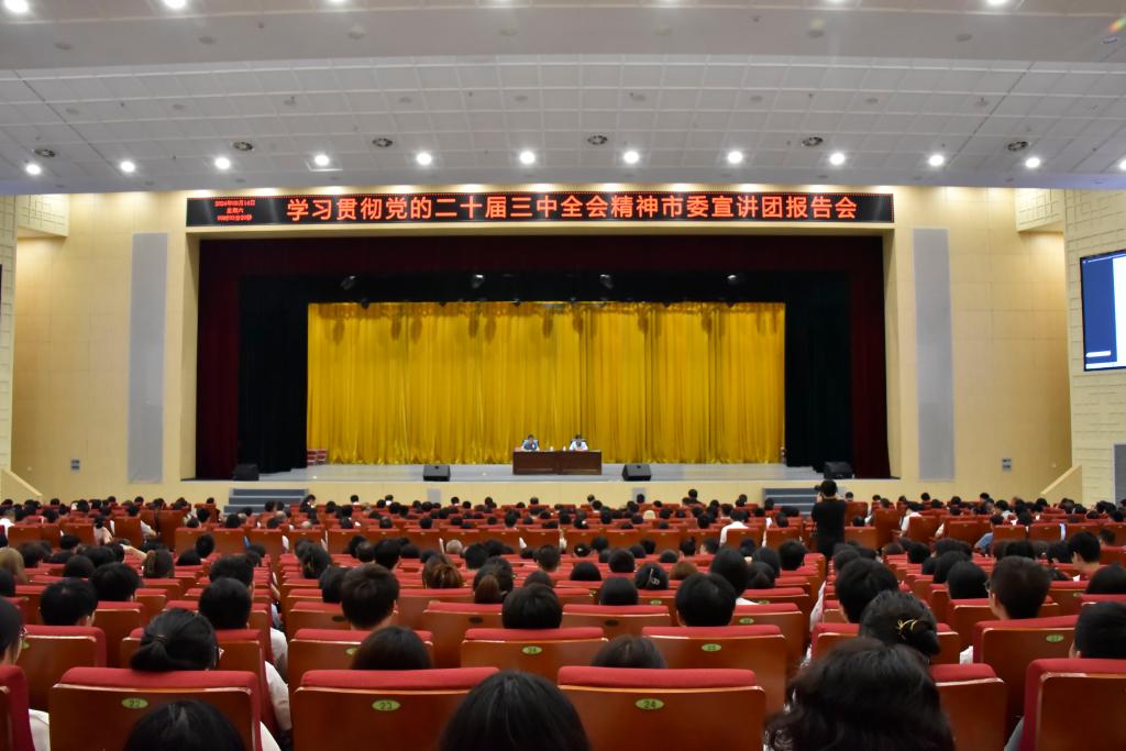 9月14日,學(xué)習(xí)貫徹黨的二十屆三中全會(huì)精神市委宣講團(tuán)在我校舉行報(bào)告會(huì),市委宣講團(tuán)成員、市委副秘書(shū)長(zhǎng)、社會(huì)工作部部長(zhǎng)廖麗萍作學(xué)習(xí)宣講報(bào)告。學(xué)校黨委書(shū)記溫學(xué)延主持報(bào)告會(huì),黨委副書(shū)記、校長(zhǎng)吳躍文等在家領(lǐng)導(dǎo)、中層以上干部及師生代表800余人參加了報(bào)告會(huì)。