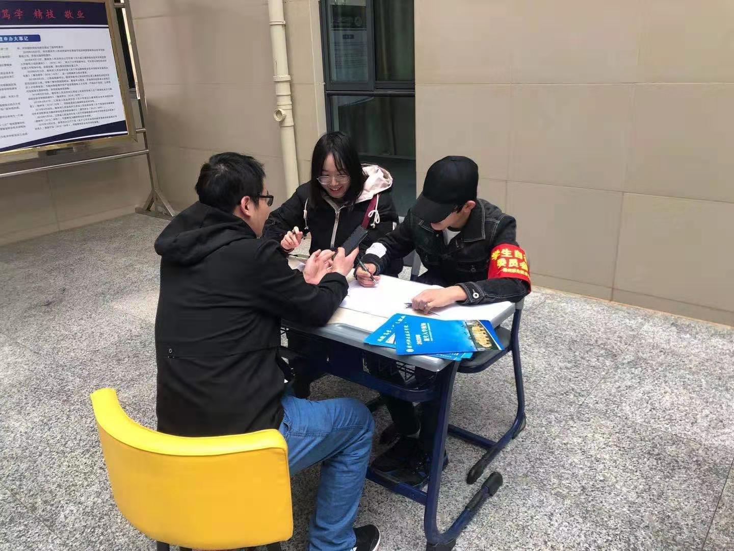 志愿服務活動在淅瀝的春雨中拉開了序幕,參與本次志愿者活動的成員們臂帶印著“學生自律委員會”字樣的袖章,分布在圖書館一樓大廳的各個辦事桌前,他們或坐或站或跑,始終以飽滿的精神狀態迎接社會擴招的新生們。