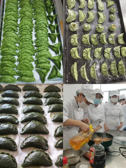 課堂上,教師講解了艾米果的歷史淵源與制作環(huán)節(jié)。在實訓環(huán)節(jié),學生們分組合作,從艾草的清洗、煮制、攪打,到面團的揉制、餡料的調配,再到最后的包制和蒸制,每個步驟都有條不紊地進行。在包制時,學生們發(fā)揮了自己獨特的創(chuàng)意,制作出多種造型的艾米果,展現(xiàn)了年輕一代對傳統(tǒng)美食的全新詮釋。課堂還融入食品安全知識,強調餐飲具生熟區(qū)分、餡料炒制規(guī)范等要點,強化學生職業(yè)素養(yǎng)。