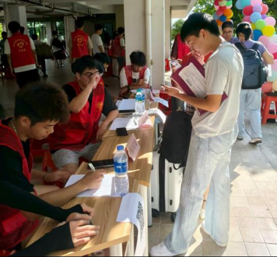 為保障9月13日至14日迎新工作高效有序,學(xué)院提前謀劃、周密部署,以“靜態(tài)指引+動(dòng)態(tài)服務(wù)”雙線并行。校園各處,清晰的路線指示牌醒目而立,身著紅色馬甲、背后印著金色“志愿者”字樣的同學(xué)們,如秋日里的暖陽(yáng),早早守候在各個(gè)點(diǎn)位。他們主動(dòng)上前接過(guò)新生的行李,笑著說(shuō)出“我?guī)^(guò)去”“我來(lái)幫您提”,用最質(zhì)樸的話語(yǔ)、最熱情的行動(dòng),化解了新生初來(lái)乍到的陌生與忐忑,讓離開(kāi)家鄉(xiāng)的不舍,悄然化作對(duì)大學(xué)生活的期待。