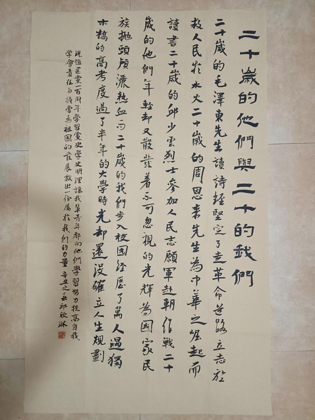 作品簡介:整個作品的形式是以大中小字來突出對比的,由過去二十歲他們的事跡聯系到現在我們的日常生活,來進行一個鮮明對比;他們二十歲的時候在為國家的建設做出了豐功偉績,而二十歲的我們應該向他們看齊,珍惜現在的生活把自己的人生規劃好,為祖國的建設獻出一份屬于我們的力量。現值建國一百周年,我們學習紅色文化、學習黨史、用書法藝術來記錄史跡,用古典雅致的文字來激勵青年一代的我們砥礪前行。