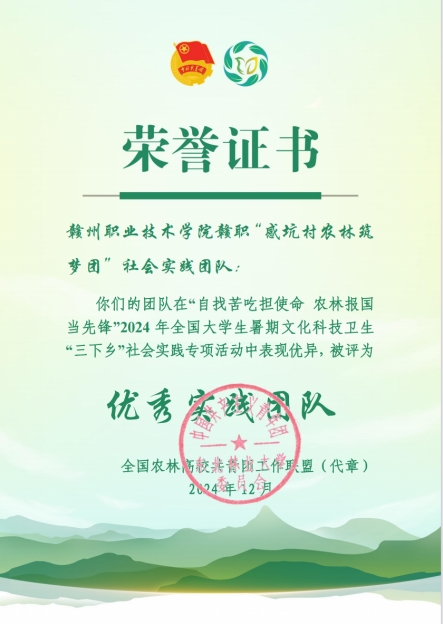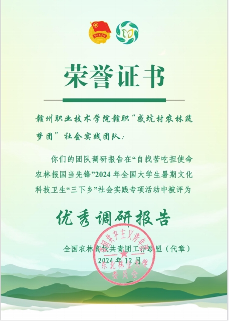 近日,由團中央青年發展部指導,團黑龍江省委學校部與全國農林高校共青團工作聯盟主辦、東北林業大學團委承辦的“自找苦吃擔使命 農林報國當先鋒”2024年全國大學生暑期文化科技衛生“三下鄉”社會實踐專項活動圓滿落幕。現代農林工程學院“感坑村農林筑夢團”在全國189支參賽隊伍中表現優異,榮獲優秀實踐團隊、優秀視頻作品、優秀調研報告三項榮譽,團隊指導教師鐘鵬榮獲“優秀指導教師”稱號,是江西省唯一入圍并獲獎的團隊。