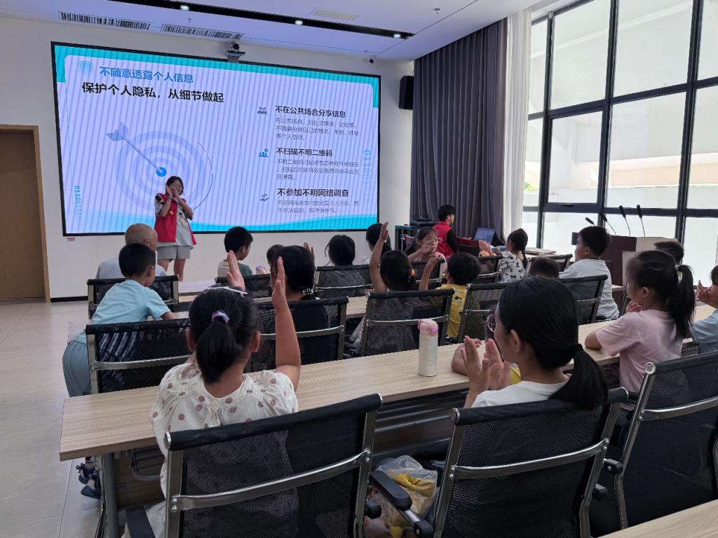首先,隊(duì)員們聚焦兒童網(wǎng)絡(luò)安全主題,化身“安全衛(wèi)士”,采用趣味課堂的形式,結(jié)合生動(dòng)形象的動(dòng)畫視頻與貼近生活的案例,向孩子們講解網(wǎng)絡(luò)詐騙、個(gè)人信息保護(hù)、不良信息辨別等知識(shí)。用通俗易懂的語言,將復(fù)雜的網(wǎng)絡(luò)安全知識(shí)轉(zhuǎn)化為孩子們易于理解的“小常識(shí)”。在知識(shí)問答環(huán)節(jié),孩子們高高舉起小手搶答,眼神中滿是渴望,臉上洋溢著自豪的笑容,現(xiàn)場氣氛活躍充滿歡聲笑語。