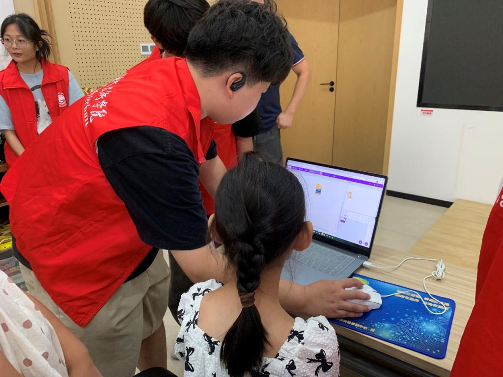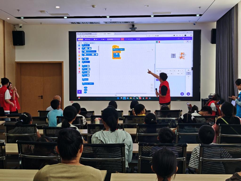 課堂講解結(jié)束后,三十余名從未接觸過編程代碼的兒童滿懷期待地坐在電腦前,在隊(duì)員們耐心又專業(yè)的指導(dǎo)下,運(yùn)用Scratch圖形化編程工具,通過拖拽“動(dòng)作”“控制”“聲音”等彩色積木塊,讓原本靜止的卡通角色在屏幕上來回奔跑跳躍,教室里不時(shí)爆發(fā)出驚喜的歡呼,“哥哥姐姐,我讓小老虎動(dòng)起來了!”在課堂上,一名小學(xué)生指著屏幕上自己用Scratch制作的動(dòng)畫興奮地喊道,屏幕上的橘色“小老虎”隨著他拖拽的指令積木靈活轉(zhuǎn)身,圍觀的孩子們眼中閃爍著前所未有的光芒。