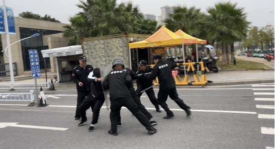 演練開始,一名“可疑人員”試圖強行闖入校園,被門衛值班人員盤查并攔下,緊接著“可疑人員”持械揮舞,將沖突爭執升級,值班人員發現該突發警情后按下一鍵報警器向警方求援,學校保安組成防暴小組使用鋼叉、防暴盾牌等裝備與“歹徒”對峙、搏斗,片刻后成功將“歹徒”制服。