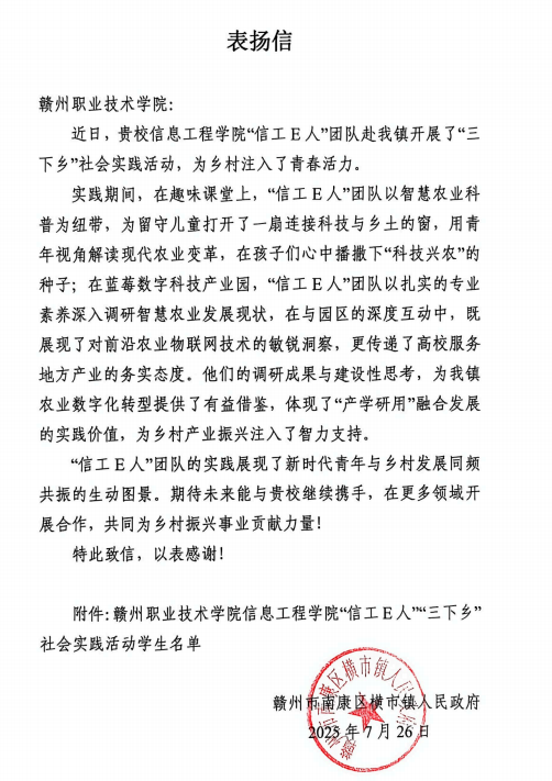 在南康區(qū)橫市鎮(zhèn),團(tuán)隊(duì)不僅完成智慧藍(lán)莓果園的深度調(diào)研,更面向28名留守兒童開展“智慧農(nóng)業(yè)小課堂”。通過(guò)搭建微型灌溉模型、演示傳感器工作原理、組織虛擬智慧果園體驗(yàn)等活動(dòng),讓孩子們直觀感受科技對(duì)農(nóng)業(yè)的改變。活動(dòng)結(jié)束后,橫市鎮(zhèn)政府發(fā)來(lái)表?yè)P(yáng)信,稱贊團(tuán)隊(duì)“既帶來(lái)了技術(shù)方案,更播下了科學(xué)種子”。