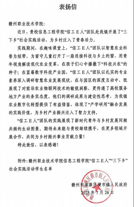 近日,贛州市南康區橫市鎮人民政府向學校發來表揚信,對學校信息工程學院“信工E人”團隊在當地開展的“三下鄉”社會實踐活動給予高度肯定,稱贊團隊用青春力量為鄉村注入活力,以專業素養助力鄉村振興。