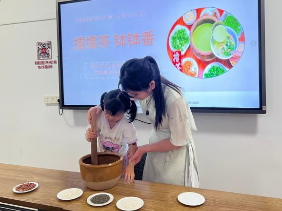客家擂茶茶香傳韻:實踐隊引導孩子們沉浸式體驗擂茶制作全流程。一句“擂杵轉呀轉,碾出的是茶香,續上的是老祖宗的智慧”的生動講解,瞬間拉近古今距離。孩子們踮腳擂茶的瞬間,是與客家先輩的跨時空對話。研磨、注水、品飲,客家飲食文化基因在體驗中悄然流淌。孩童“原來爺爺愛喝的茶里藏著這么多故事”的感悟和家長“非遺離我們這么近”的社交媒體分享,生動詮釋了“見人見物見生活”的傳承真諦。這種體驗式傳承,讓客家擂茶從靜態符號變為可感知的生活方式,是青年活化傳統文化、連接生活場景的創新實踐。