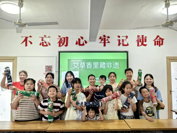 手作溫情巧解民需:實踐隊細心捕捉居民健康需求,在查閱資料多方請教后,創新設計艾草護頸枕手作活動。活動現場艾香氤氳,親子搭檔默契協作,將溫經通絡的艾草仔細裝入枕套。指尖的溫度與草本的芬芳在協作中交融,制成的不僅是一件實用好物,更是一份承載關懷的健康禮物。參與制作的阿姨笑著說:“以前只知艾草能驅蚊,沒想到做枕頭這么好,自己孩子親手做的,睡起來都覺得格外香。”這種基于需求響應、融合傳統技藝與健康關懷的沉浸式手作,精準實踐了“傳藝亦傳情”的服務理念。