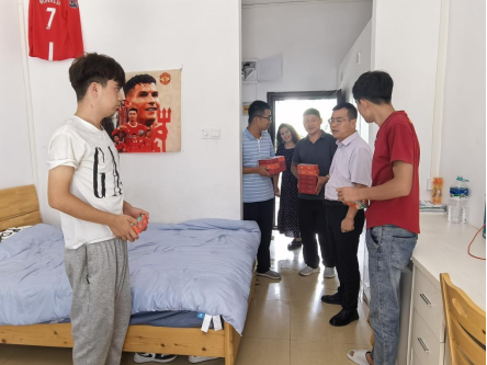 走進寢室,領導們與同學們親切交談,詳細詢問大家在贛的學習進度、生活適應情況及實際困難。溫繼榮指出,中秋是闔家團圓的傳統佳節,雖然同學們遠離家鄉求學,但學校就是大家的“第二故鄉”。“這份月餅承載著學校的牽掛與心意,希望能讓大家在異鄉也嘗到家的味道,感受到濃濃的節日溫情。”針對即將到來的國慶假期,溫繼榮重點圍繞四大安全要點提出要求:一是繃緊人身安全弦,國慶外出研學需嚴格服從帶隊老師安排,遵守交通規則,規避意外風險;二是筑牢財產安全防線,離開寢室前務必關好門窗、切斷非必要電源,妥善保管貴重物品;三是守好飲食安全關,堅持良好衛生習慣,合理安排飲食,避免暴飲暴食;四是嚴守假期管理規定,特殊情況需提前履行請假報備手續,確保行程可追溯。