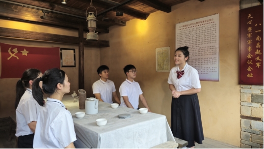 活動當天,師生們首先來到天心圩這片承載著厚重歷史的土地,師生們先后探訪葉氏祖屋、天心整軍園以及整軍舊址前那株曾掩護過八百將士宣誓的榕樹。1927年10月,正是在天心圩,朱德率領的南昌起義軍余部在極端困境中進行了整軍,為革命保存了寶貴的有生力量。站在當年整軍的大榕樹下,師生們仿佛能聽到那激昂的演講聲,看到八百將士在晨曦中堅定舉起槍支的壯舉。通過講解老師的詳細介紹,大家深刻理解了天心整軍在革命危急關頭的重要作用,以及它如何成為人民軍隊發展史上的一個重要轉折點。