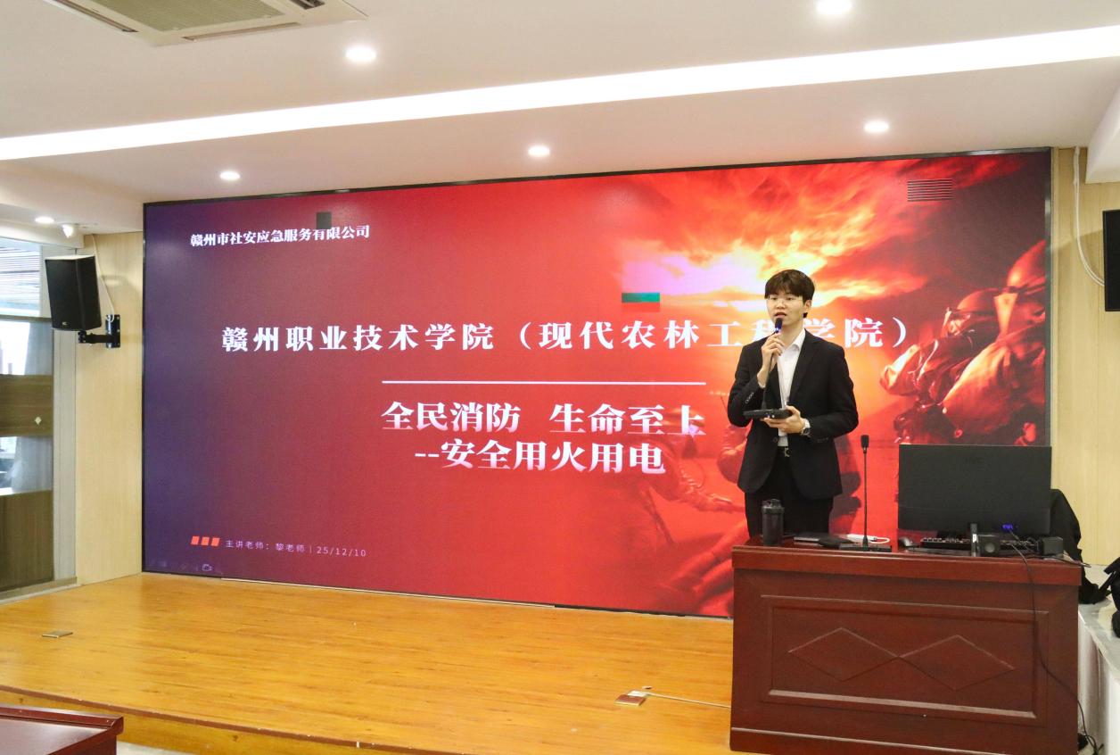 為切實落實學校消防安全工作要求,進一步強化教職工的消防安全意識與應急處置能力,12月10日下午,現代農林工程學院在畢昇樓301教室成功舉辦以“全民消防 生命至上——安全用火用電”為主題的消防安全知識講座。本次講座特別邀請了贛州市社安應急服務有限公司專家黎老師進行專題講授,黎老師為全體教職工講授了消防安全知識與火災自救方法。全院教職工參加了此次培訓。