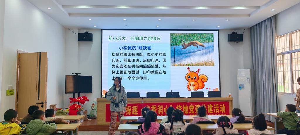 活動現(xiàn)場,曾佳怡同學(xué)以《小動物的腳印魔法:探索自然的小秘密》為主題,以深入淺出的方式向社區(qū)小朋友們展示了不同動物的腳印特征,引導(dǎo)小朋友們探索自然界的奧秘,激發(fā)了他們對科學(xué)探索的濃厚興趣,也為后續(xù)的“腳印偵探”互動體驗(yàn)環(huán)節(jié)奠定了堅(jiān)實(shí)的基礎(chǔ)。