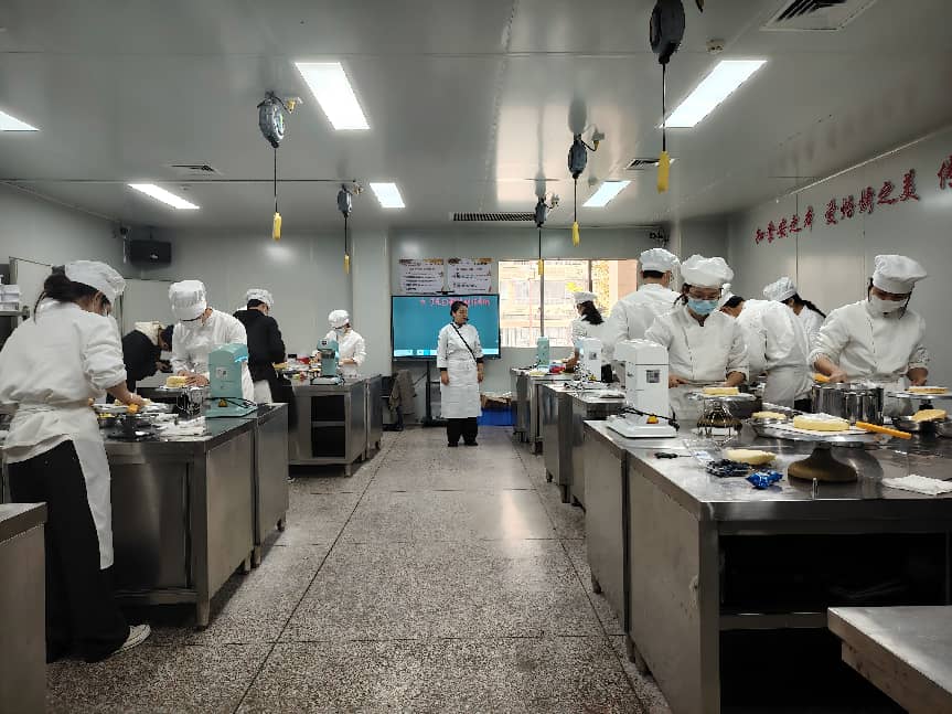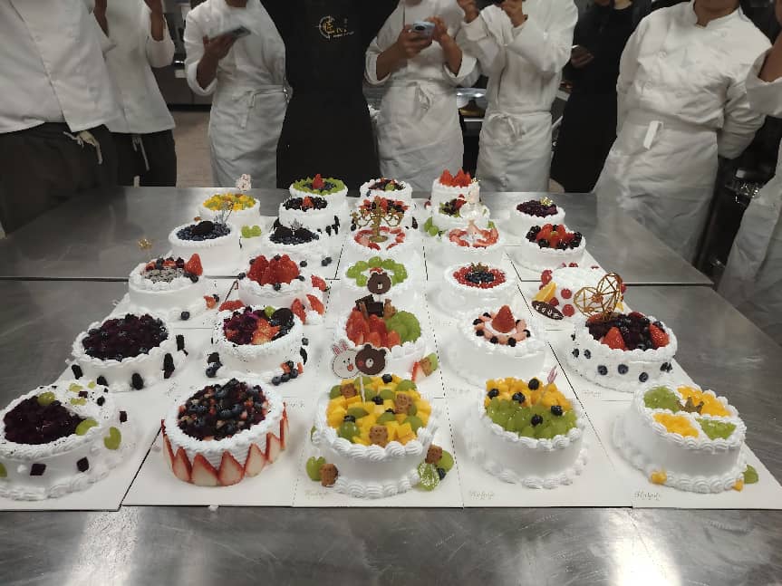 本次實訓突破了傳統教學模式,以“真實項目驅動”為核心,構建了“課堂即車間、教學即生產”的教學場景,充分彰顯了學院“產教融合、校企共育”的育人特色。實訓內容緊密對接行業實際與市場需求,注重學習過程與生產流程的無縫銜接。實訓初期,徐師傅著重強調:“基礎技術是工藝之本,更是質量之基?!痹诤罄m的實訓中,他系統拆解糕點制作各環節的基礎動作與技術要點,針對關鍵操作進行“手把手糾正”“一對一指導”,幫助學生夯實基本功。隨著實訓推進,課程內容從技法拓展延伸至創意表達。學生不僅系統掌握了海綿蛋糕、重油蛋糕等多元產品的核心工藝與科學原理,更在“海鹽芝士爆漿蛋糕”“提拉米蘇”等綜合創意產品制作中,將設計思維、審美品位與情感表達融入蛋糕裱花、創意裝飾等環節,實現了從技術練習到創意輸出的跨越,也實現了操作技藝與綜合素養的雙重提升。