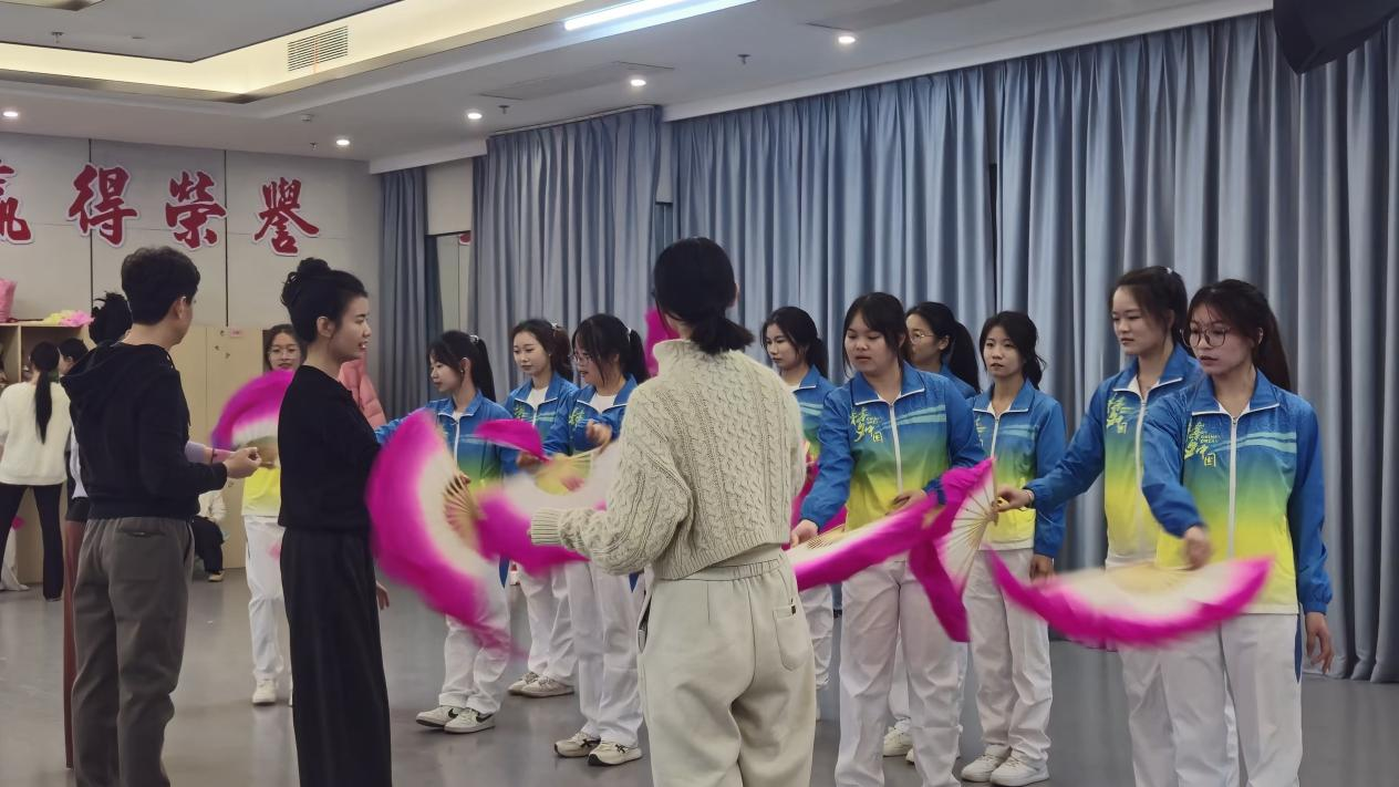 隨后,楊俊老師及其學生手把手教大家練習贛南采茶戲的“三絕”—— 矮子步、扇子花、單水袖等經典動作,讓同學們在實踐互動中切身感受到非遺藝術的獨特魅力與匠心傳承,使他們對“臺上一分鐘,臺下十年功”的執著堅守有了更為真切的體會。