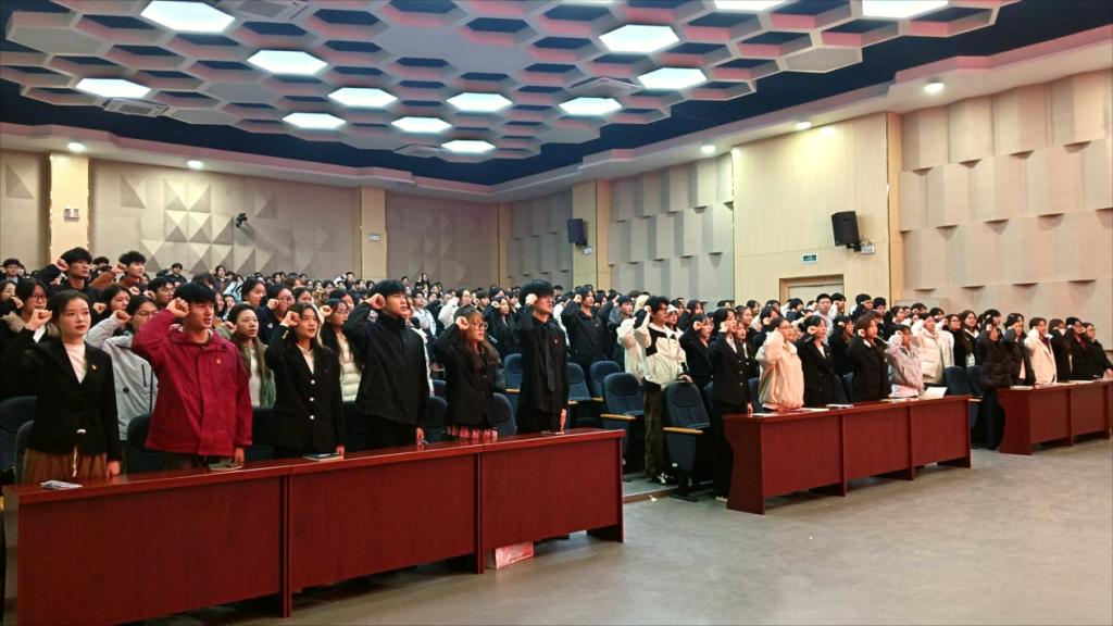 在領誓人俞金貝同學的帶領下,全體新團員面向團旗,舉起右拳莊嚴宣誓。鏗鏘有力的誓言在會場回蕩,彰顯著青年一代聽黨話、跟黨走的堅定決心和為實現中華民族偉大復興貢獻青春力量的使命擔當。儀式在全體人員齊聲高唱《中國共產主義青年團團歌》中圓滿落幕,激昂的旋律進一步激發了團員青年的榮譽感與歸屬感。