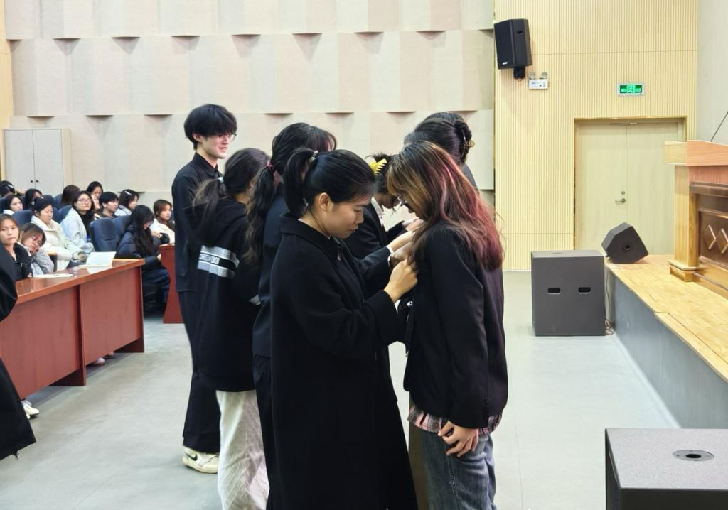 在莊嚴肅穆的氛圍中,團總支書記與老團員代表一同為新團員佩戴團徽。團徽在燈光下熠熠生輝,不僅是中國共產主義青年團的標志,更象征著光榮、責任與奉獻。每一枚團徽的佩戴,都承載著組織的殷切期望與先輩的愛國初心,提醒新團員時刻以團員標準嚴格要求自己,在學習和生活中發揮模范帶頭作用。