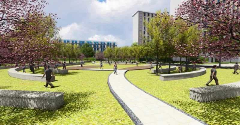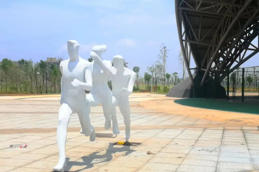 雕塑“奮進”便坐落在這風雨球場旁,它由三個你追我趕的青年形象組成,他們面朝學院行知大道方向,營造出學院積極向上、催人奮進的氛圍。