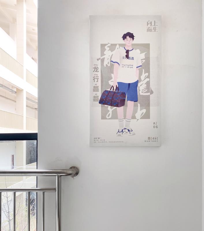 天祥樓中棟與北棟的樓梯轉角,我們設計安放了糅合了中國文化的生僻字服裝插畫,力求傳播傳統文化、樹立民族自信心。