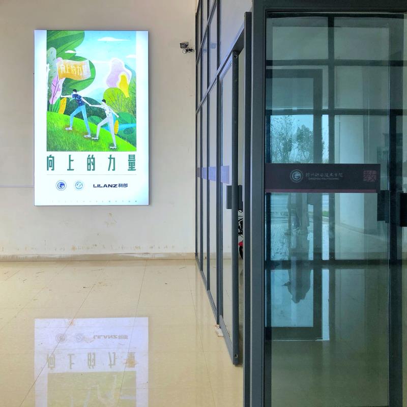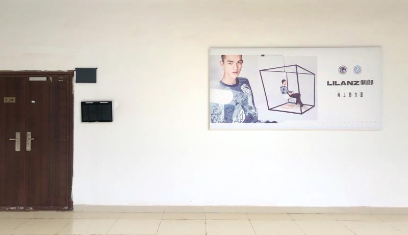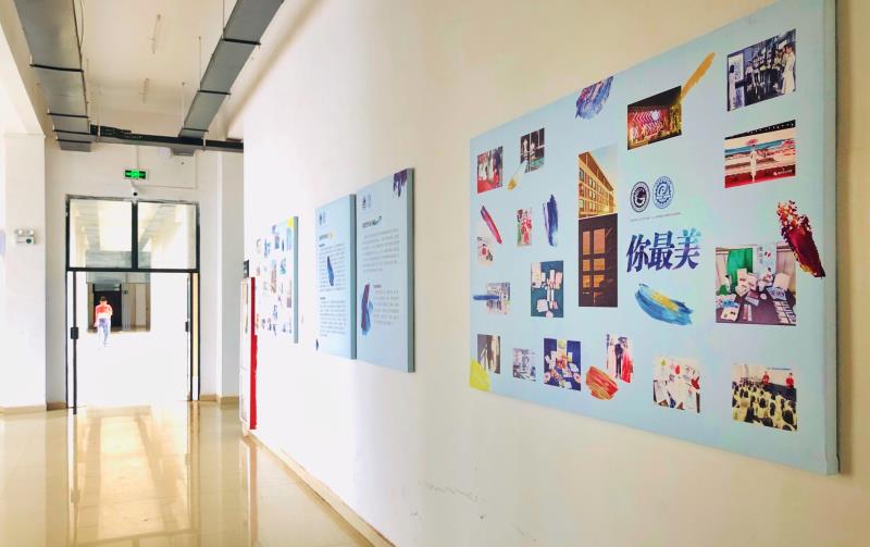 我們的教學樓“藝術設計系”五個大字后的主畫面,寓意校企雙方攜手并肩、開拓進取。一樓走廊則分別在兩處安放有系里服裝與服飾設計專業、廣告設計專業簡介、作品和利郎(中國)有限公司發展史。