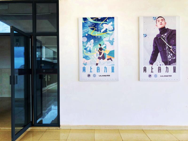 要問新在哪,且從墻面文化說起。“向上的力量”——是我們整體墻面群設計中貫徹的主題。在國家職業教育“產教融合”的趨勢下,系內多次商討后,藝術設計系決定與合作企業利郎(中國)有限公司聯名,打造以“攜手、共進、向前、探索”為中心思想的系列墻面裝飾。
